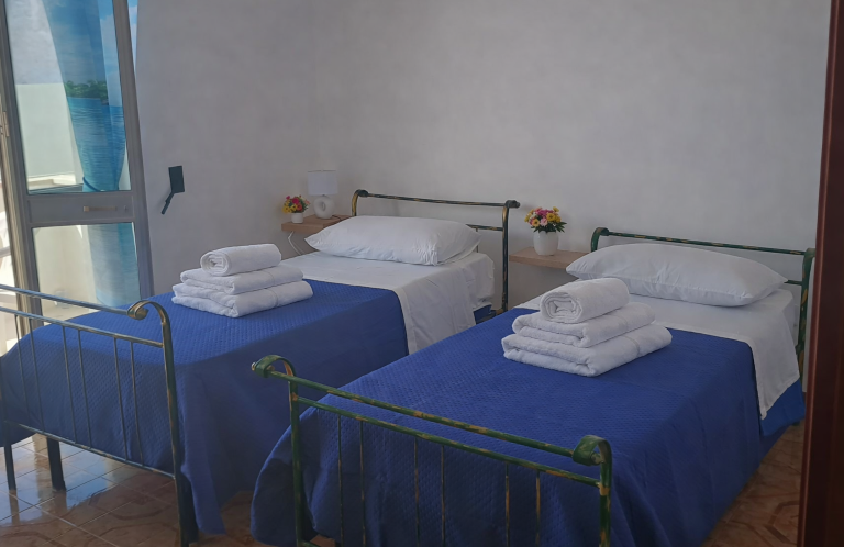 La camera con lettini è pensata per offrire comfort e funzionalità in un’atmosfera fresca, ordinata e accogliente. I due letti si inseriscono in uno spazio luminoso e armonioso, ideale per amici, ragazzi o famiglie. Anche qui, l’affaccio su un ampio balcone regala respiro all’ambiente e una sensazione di leggerezza che rende il soggiorno ancora più piacevole.