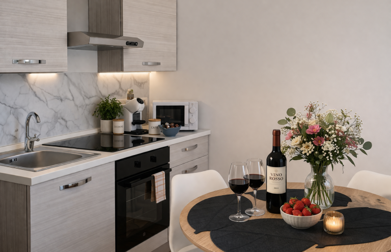 La cucina di Mare Deluxe è uno spazio moderno, funzionale e accogliente, pensato per essere vissuto con naturalezza in ogni momento della giornata. L’ambiente, ben organizzato e luminoso, è dotato di piano cottura a induzione e di tutto il necessario per preparare colazioni rilassanti, pranzi in famiglia o cene in totale comodità. La zona pranzo, intima e curata, contribuisce a creare un’atmosfera piacevole e conviviale, dove praticità ed eleganza si incontrano con semplicità.